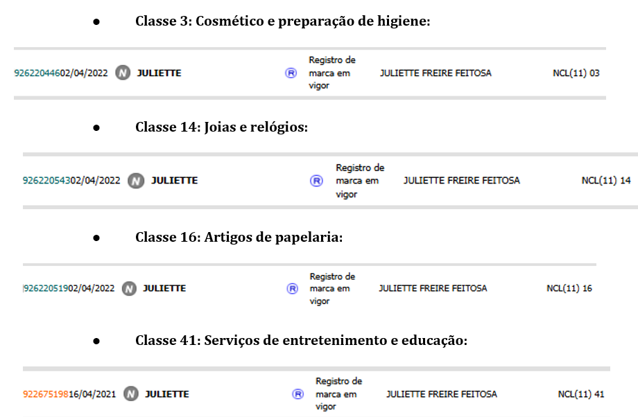 Atualmente, Juliette possui 18 (dezoito) marcas registradas em 10 (dez) classes diferentes, garantindo a proteção da sua marca em diversas áreas.